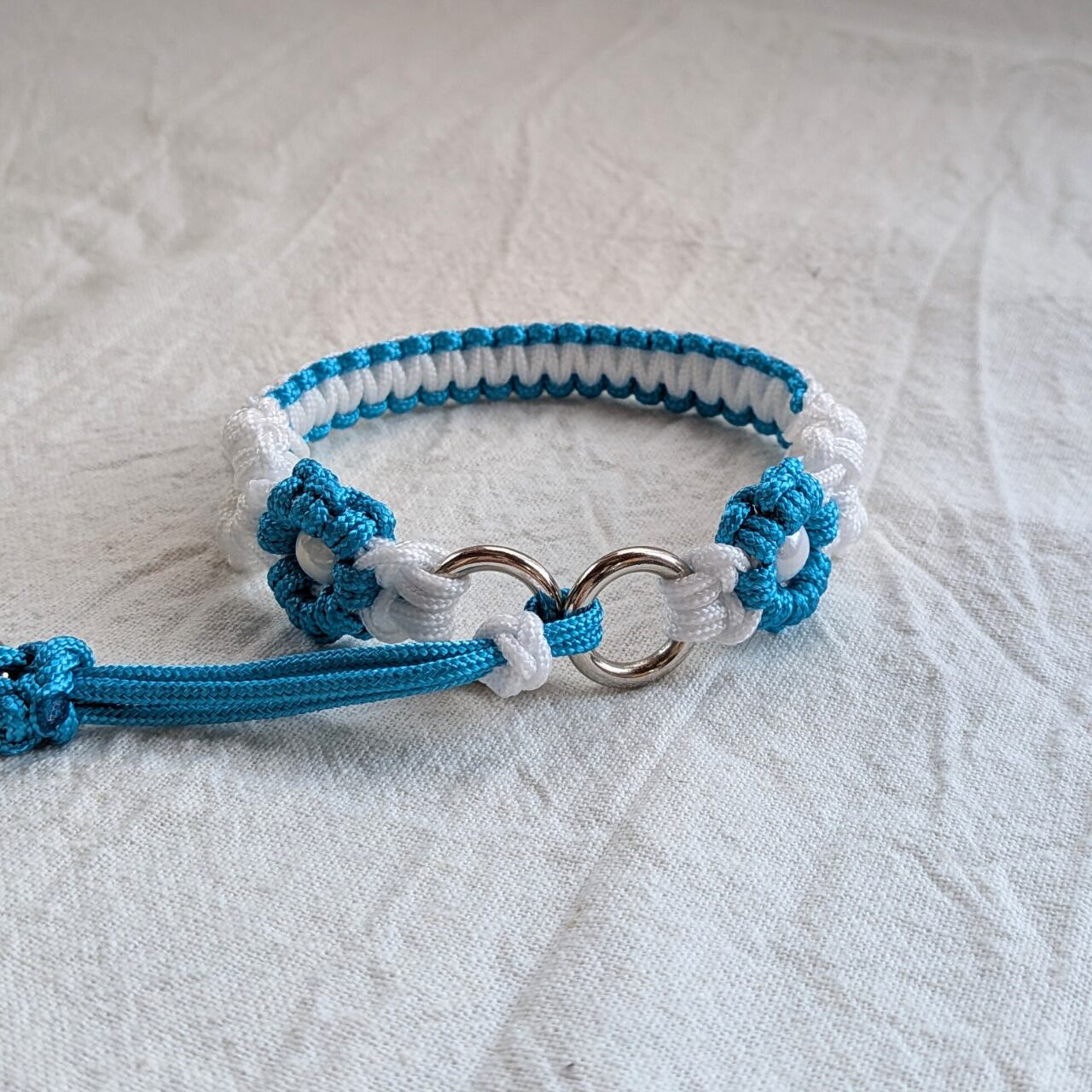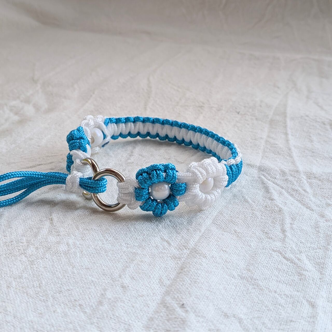 2ミリの細いパラコードを使用しています。白と水色の組み合わせがさわやかに仕上がっています。