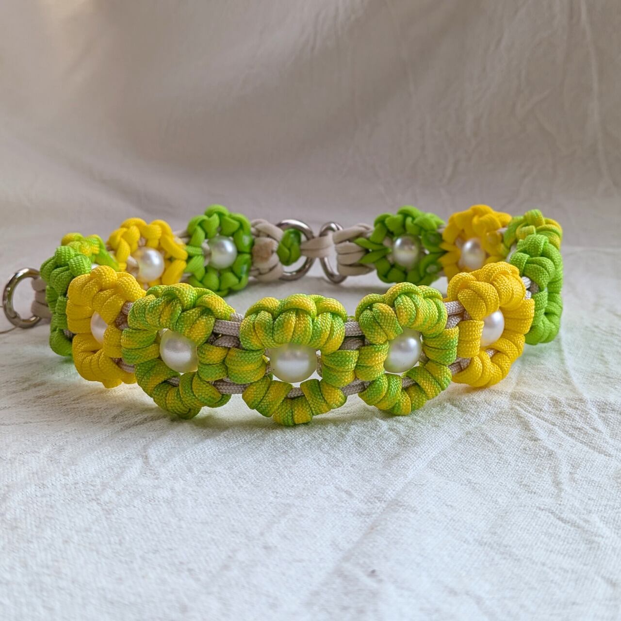黄色と黄緑、黄緑のミックスの明るいお花首輪です。